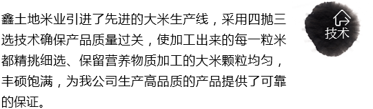鐵等礦物質,無污染的環(huán)境,豐產(chǎn)的水稻資源,使鑫土地米業(yè)不斷發(fā)展壯大,成為綏化地區(qū)新崛起的一支精制大米生產(chǎn)的生力軍。